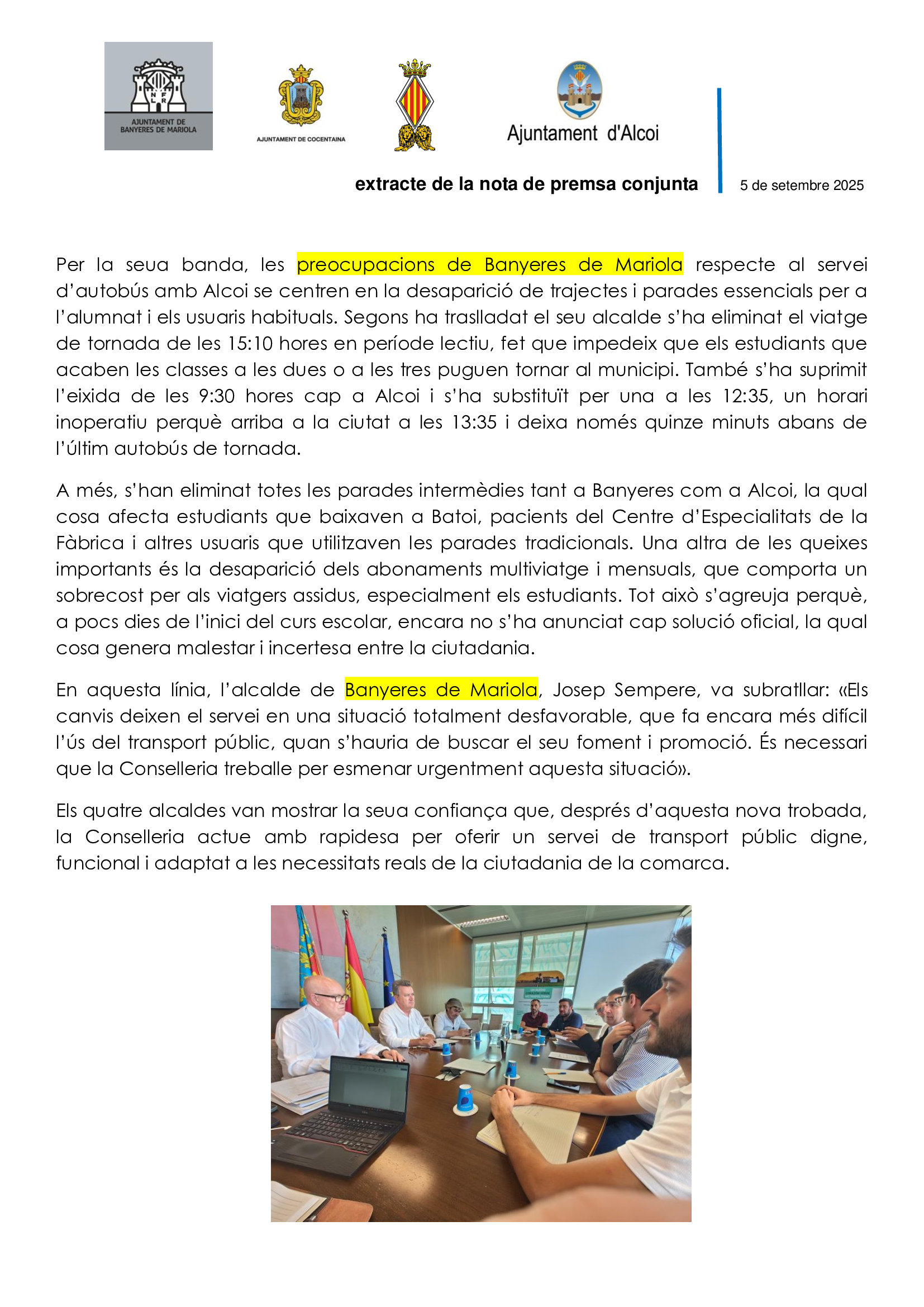 Esta tarde, martes, 4 de septiembre, el alcalde acude a una reunión en València, en la Dirección General de Transportes para expresar, de primera mano, el descontento por todas las modificaciones producidas en la Línea Banyeres de Mariola-Alcoi.