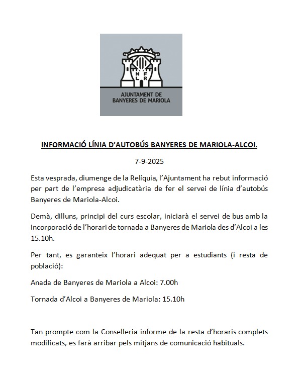 Por eso, el pasado día 2 de septiembre, el Ayuntamiento de Banyeres de Mariola realizó una segunda queja formal pidiendo la modificación del horario de la 2ª ida a Alcoy, de la reactivación de los bonos y la reincorporación de la parada de Batoi (aspectos que quedan pendientes de resolver).